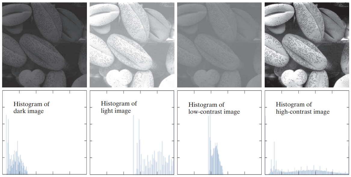 히스토그램의 모형은 이미지의 외형에 따라 결정된다. 만약 검정색이 지배적이면 히스토그램의 대부분이 낮은 곳에 집중적으로 분포되고 만약 경계가 뚜렷한(contrast가 높은) 이미지라면 히스토그램이 모든 히스토그램이 균일하게 도출될 것이다.