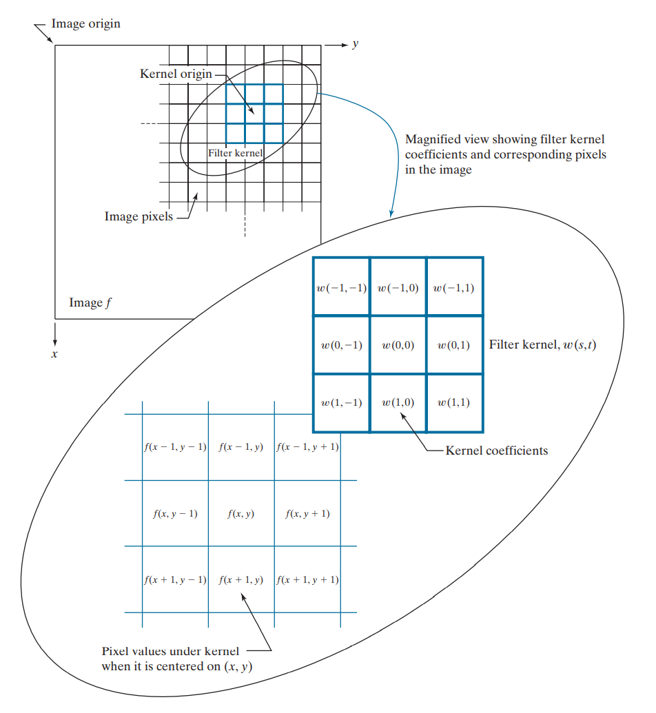 이러한 연산들이 내적에 합이기 때문에 linear spatial filtering이라고 불리고, spatial convolution과 동의어를 이루기도 한다. filter의 중심이 모든 이미지의 픽셀을 지난다고 가정할 때