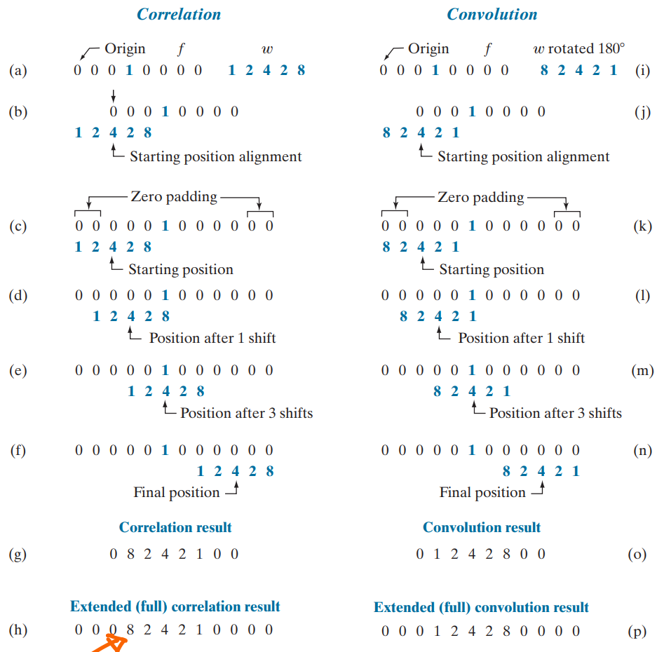 convolution은 correlation을 180도 뒤집은 것이다. 이는 중앙의 값 하나만 1이고 나머지가 0인 discrete Unit impulse에다가 correlation을 시행해주면 convolution이 된다. 이 impulse는 Lineary system theory의 fundamental이며, Discrete impulse of strength(amplitude)는 중간에 들어갈 값을 의미하고 떨어진 위치와 함께 다음과 같이 나타낸다.