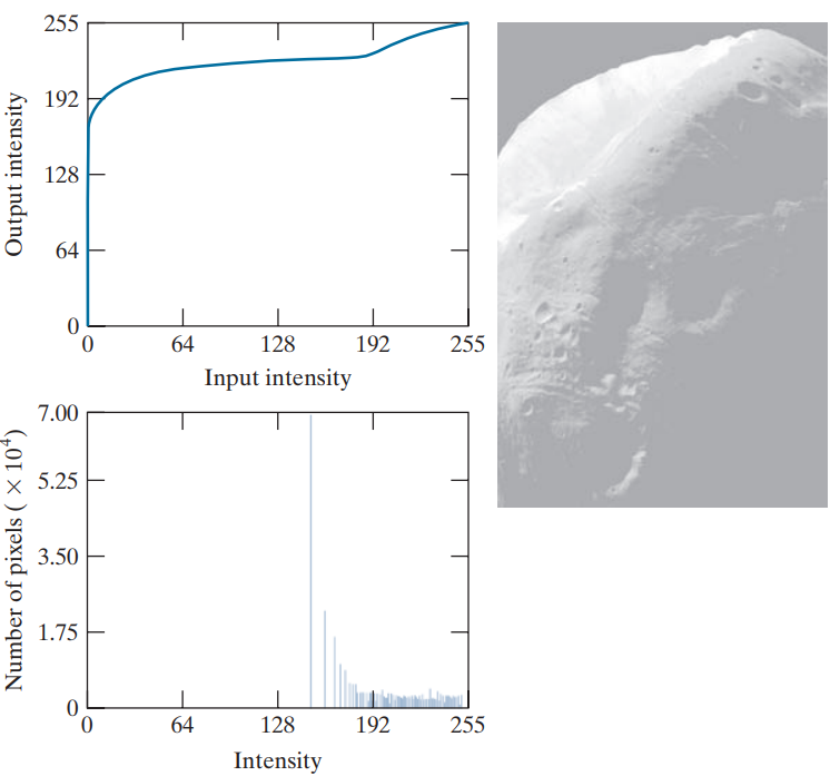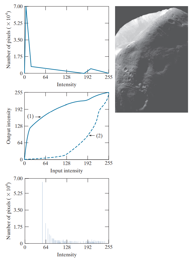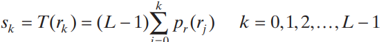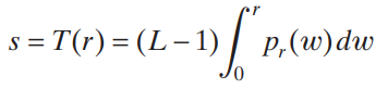 여기에 히스토그램 평탄화를 위한 함수(A transformation function of particular importance in image processing)인 T(r)의 정의로 나타낸다. 이는 임의의 변수 r에 대한 Cumulative distribution function(CDF)로, 더미 변수읜 w에 대해 Pr(w)이 언제나 참이므로, CDF인 T(r)또한 언제나 단조함수이다. 또한, PDF의 전체 영역에 대한 합은 1이므로 (L-1)을 곱해주면 범위에 대한 조건도 만족한다. 이를 식으로 나타내면,